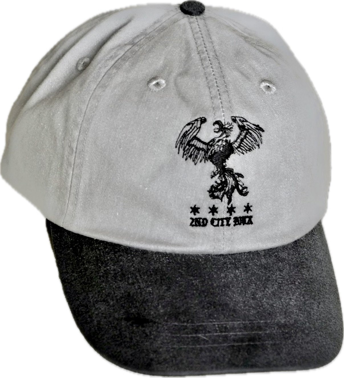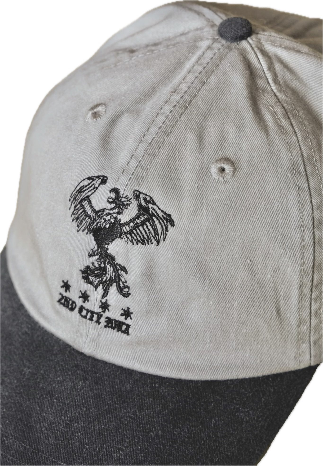 The two tone ASH Cap is embroidered on Adams Headwear, featuring the original phoenix drawing, a cool mesh interior liner, and leather strap.
